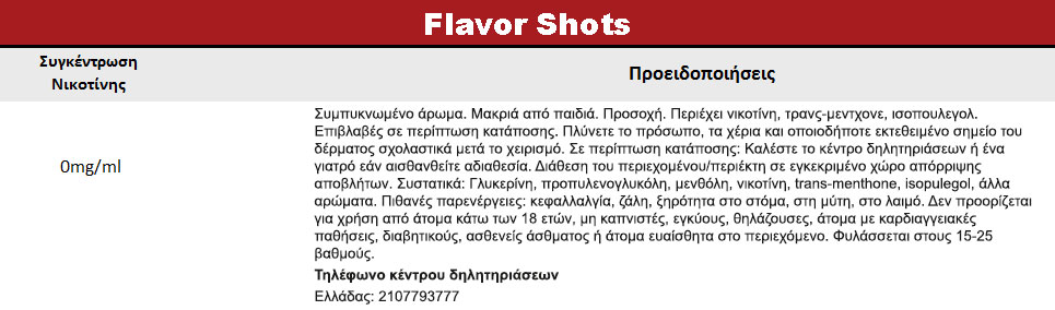Μακριά από παιδιά. Προσοχή. Περιέχει νικοτίνη, τρανς-μεντχονε, ισοπουλεγολ. Επιβλαβές σε περίπτωση κατάποσης. Πλύνετε το πρόσωπο, τα χέρια και οποιοδήποτε εκτεθειμένο σημείο του δέρματος σχολαστικά μετά το χειρισμό. Σε περίπτωση κατάποσης: Καλέστε το κέντρο δηλητηριάσεων ή ένα γιατρό εάν αισθανθείτε αδιαθεσία. Διάθεση του περιεχομένου/περιέκτη σε εγκεκριμένο χώρο απόρριψης αποβλήτων. Συστατικά: Γλυκερίνη, προπυλενογλυκόλη, μενθόλη, νικοτίνη, trans-menthone, isopulegol, άλλα αρώματα. Πιθανές παρενέργειες: κεφαλλαλγία, ζάλη, ξηρότητα στο στόμα, στη μύτη, στο λαιμό. Δεν προορίζεται για χρήση από άτομα κάτω των 18 ετών, μη καπνιστές, εγκύους, θηλάζουσες, άτομα με καρδιαγγειακές παθήσεις, διαβητικούς, ασθενείς άσθματος ή άτομα ευαίσθητα στο περιεχόμενο. Φυλάσσεται στους 15-25 βαθμούς.