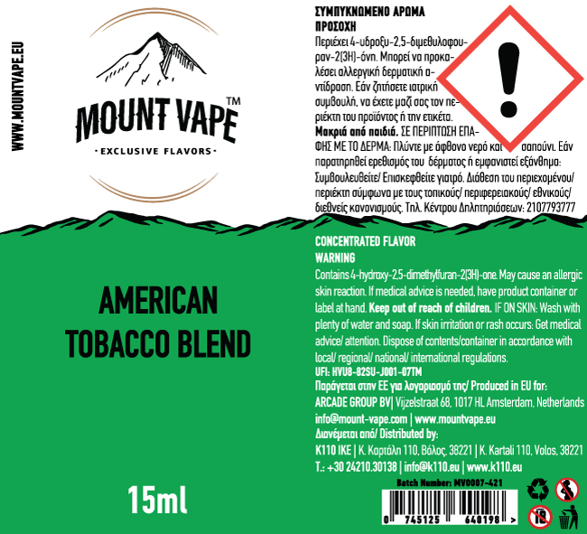 Μία αυθεντική γεύση καπνού που διακρίνεται από την εξαιρετική ποιότητα κλασικών αμερικανικών ποικιλιών καπνού. To MOUNT VAPE AMERICAN TOBACCO BLEND 15ML/60ML FLAVORSHOT αποτελεί την πιο κατάλληλη επιλογή για ατμιστές, που τους αρέσουν πολύ οι εκλεπτυσμένες ποικιλίες καπνού.