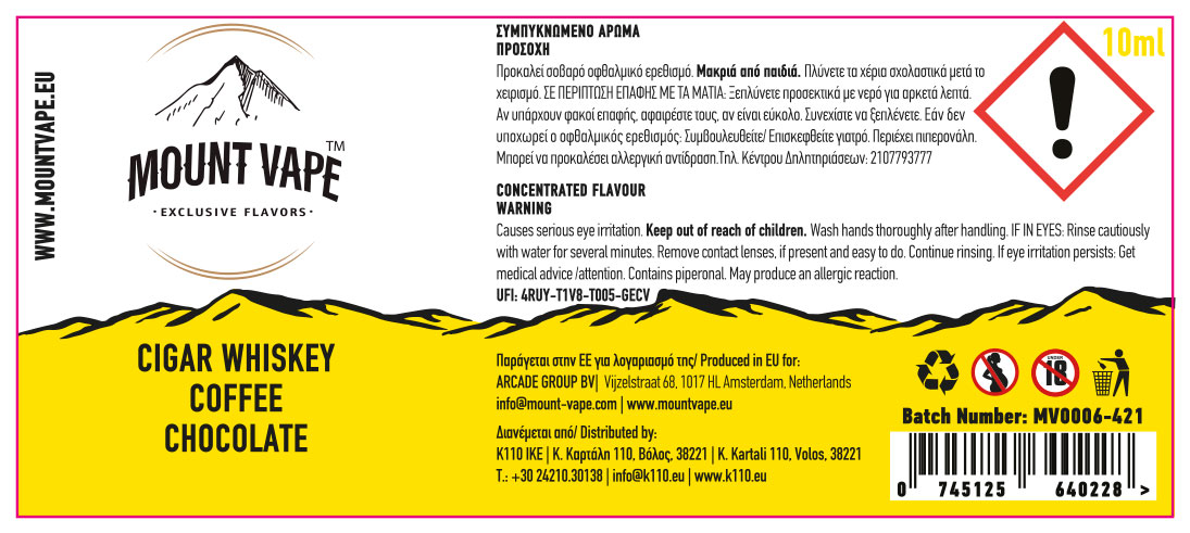 Απολαύστε το MOUNT VAPE CIGAR WHISKEY COFFEE CHOCOLATE 10ML/30ML FLAVORSHOT συνδυάζοντάς τη με ένα ποτήρι ουίσκι ή μετά από ένα καλό και πλούσιο γεύμα δίπλα στο τζάκι.