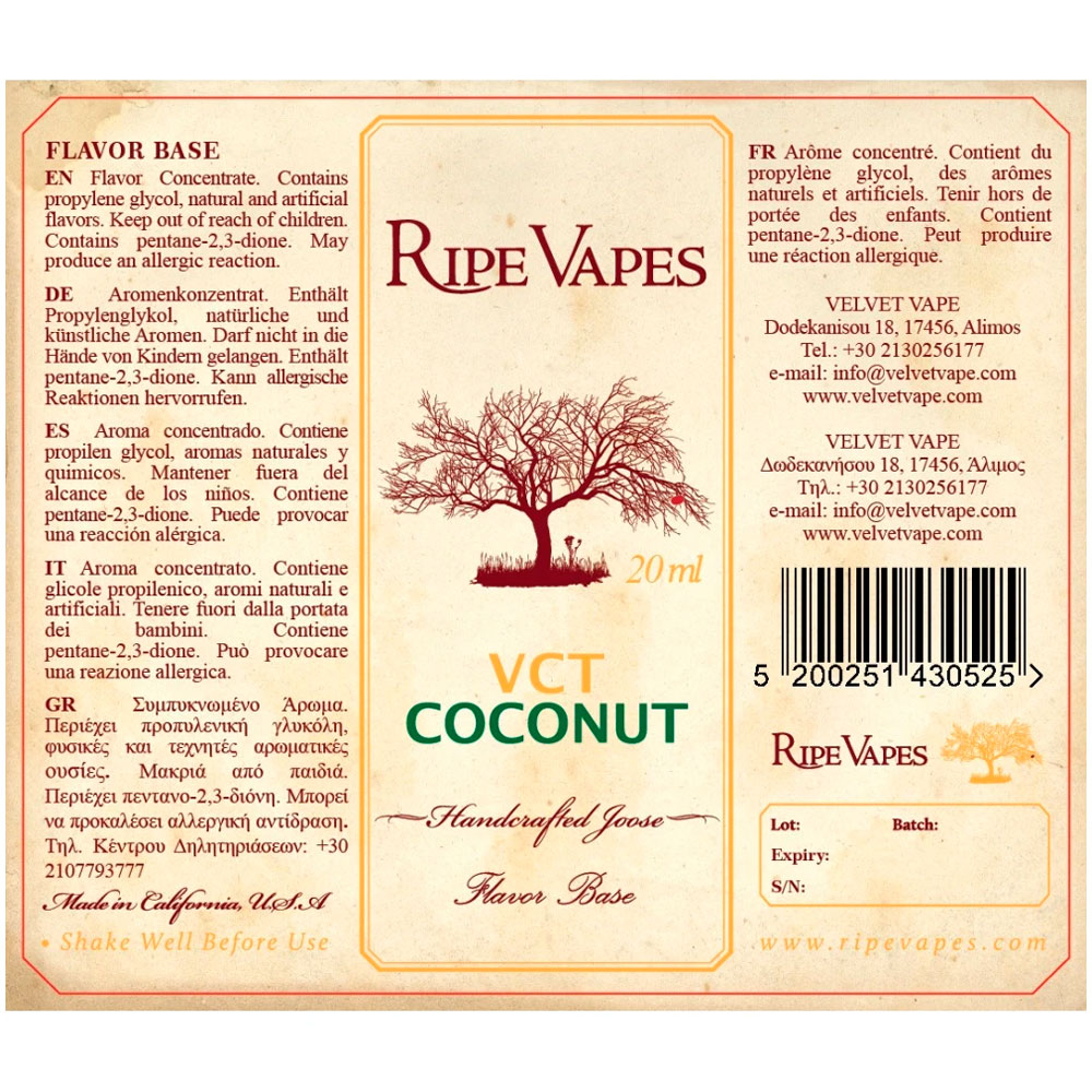 Το Ripe Vapes VCT Coconut 20ml to 60ml Flavor χρειάζεται 48 ώρες για να ωριμάσει.