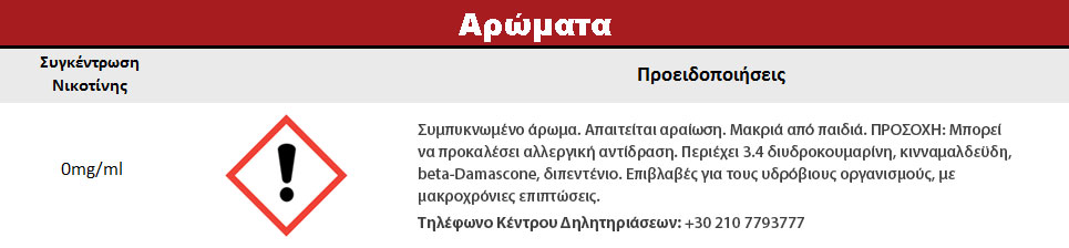 ΠΡΟΣΟΧΗ: Mπορεί να προκαλέσει αλλεργική αντίδραση. Περιέχει 3.4 διυδροκουμαρίνη, κινναμαλδεϋδη, beta-Damascone, διπεντένιο. Επιβλαβές για τους υδρόβιους οργανισμούς, με μακροχρόνιες επιπτώσεις. Μακριά από παιδιά.