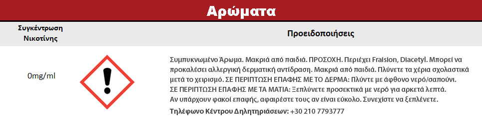 Περιέχει Fraision, Diacetyl. Μπορεί να προκαλέσει αλλεργική δερματική αντίδραση. Μακριά από παιδιά. Πλύνετε τα χέρια σχολαστικά μετά το χειρισμό. ΣΕ ΠΕΡΙΠΤΩΣΗ ΕΠΑΦΗΣ ΜΕ ΤΟ ΔΕΡΜΑ: Πλύντε με άφθονο νερό/σαπούνι. ΣΕ ΠΕΡΙΠΤΩΣΗ ΕΠΑΦΗΣ ΜΕ ΤΑ ΜΑΤΙΑ: Ξεπλύνετε προσεκτικά με νερό για αρκετά λεπτά. Αν υπάρχουν φακοί επαφής, αφαιρέστε τους αν είναι εύκολο. Συνεχίστε να ξεπλένετε.