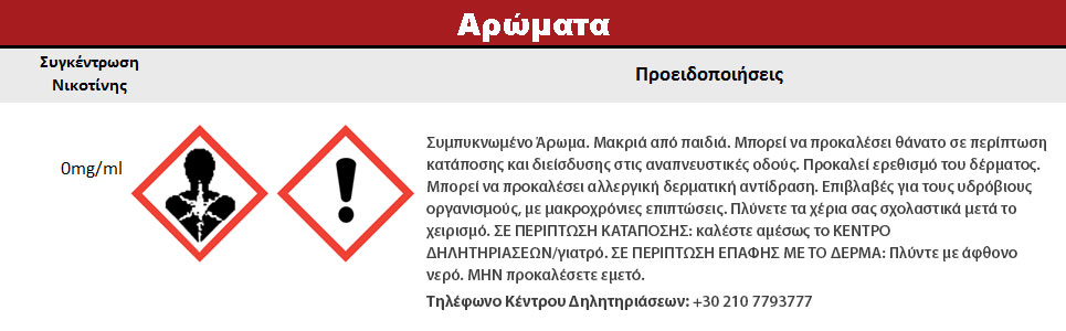 Συμπυκνωμένο Άρωμα. Μακριά από παιδιά. Μπορεί να προκαλέσει θάνατο σε περίπτωση κατάποσης και διείσδυσης στις αναπνευστικές οδούς. Προκαλεί ερεθισμό του δέρματος. Μπορεί να προκαλέσει αλλεργική δερματική αντίδραση. Επιβλαβές για τους υδρόβιους οργανισμούς, με μακροχρόνιες επιπτώσεις. Πλύνετε τα χέρια σας σχολαστικά μετά το χειρισμό. ΣΕ ΠΕΡΙΠΤΩΣΗ ΚΑΤΑΠΟΣΗΣ: καλέστε αμέσως το ΚΕΝΤΡΟ ΔΗΛΗΤΗΡΙΑΣΕΩΝ/γιατρό. ΣΕ ΠΕΡΙΠΤΩΣΗ ΕΠΑΦΗΣ ΜΕ ΤΟ ΔΕΡΜΑ: Πλύντε με άφθονο νερό. ΜΗΝ προκαλέσετε εμετό.