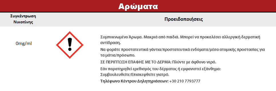 Συστατικά: Συμπυκνωμένο μείγμα αρωμάτων, διαλυμένο σε προπυλενική γλυκόλη (FEMA 2940). Δεν περιέχει ζάχαρη και γλουτένη.