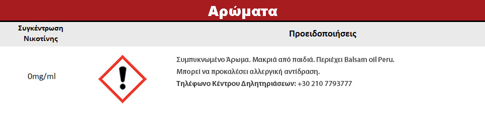 Συστατικά: Συμπυκνωμένο μείγμα αρωμάτων, διαλυμένο σε προπυλενική γλυκόλη (FEMA 2940). Δεν περιέχει ζάχαρη και γλουτένη.