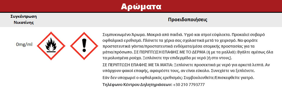 Συστατικά: Συμπυκνωμένο μείγμα αρωμάτων, διαλυμένο σε προπυλενική γλυκόλη (FEMA 2940). Δεν περιέχει ζάχαρη και γλουτένη.