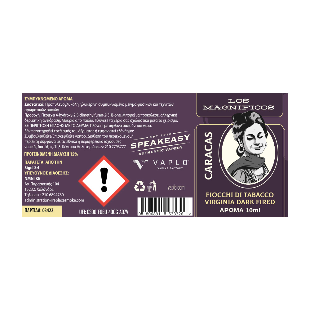 Μια πόλη τόσο συναρπαστική όσο και πειστική, το πλήθος των επαναστάσεων και το ταραχώδες χαρακτηριστικό της Βενεζουέλας, μιας τροπικής και ζεστής χώρας όλο το χρόνο που χαρακτηρίζεται από εκπληκτική θέα. Το συμπυκνωμένο άρωμα Speakeasy Caracas 10ml Flavor συνδυάζει υπέροχα την αυθεντική γεύση της ευγενούς παράδοσης της Βενεζουέλας. Πρόκειται για ένα ακαταμάχητο άρωμα από dark fired καπνό Virginia.