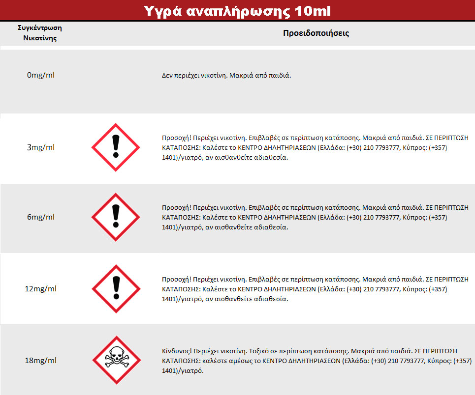 Υγρό αναπλήρωσης ηλεκτρονικού τσιγάρου. Συστατικά: Προπυλενογλυκόλη, γλυκερίνη, νικοτίνη, αρωματικές ουσίες. Προσοχή. Περιέχει νικοτίνη. Επιβλαβές σε περίπτωση κατάποσης. Μακριά από παιδιά.